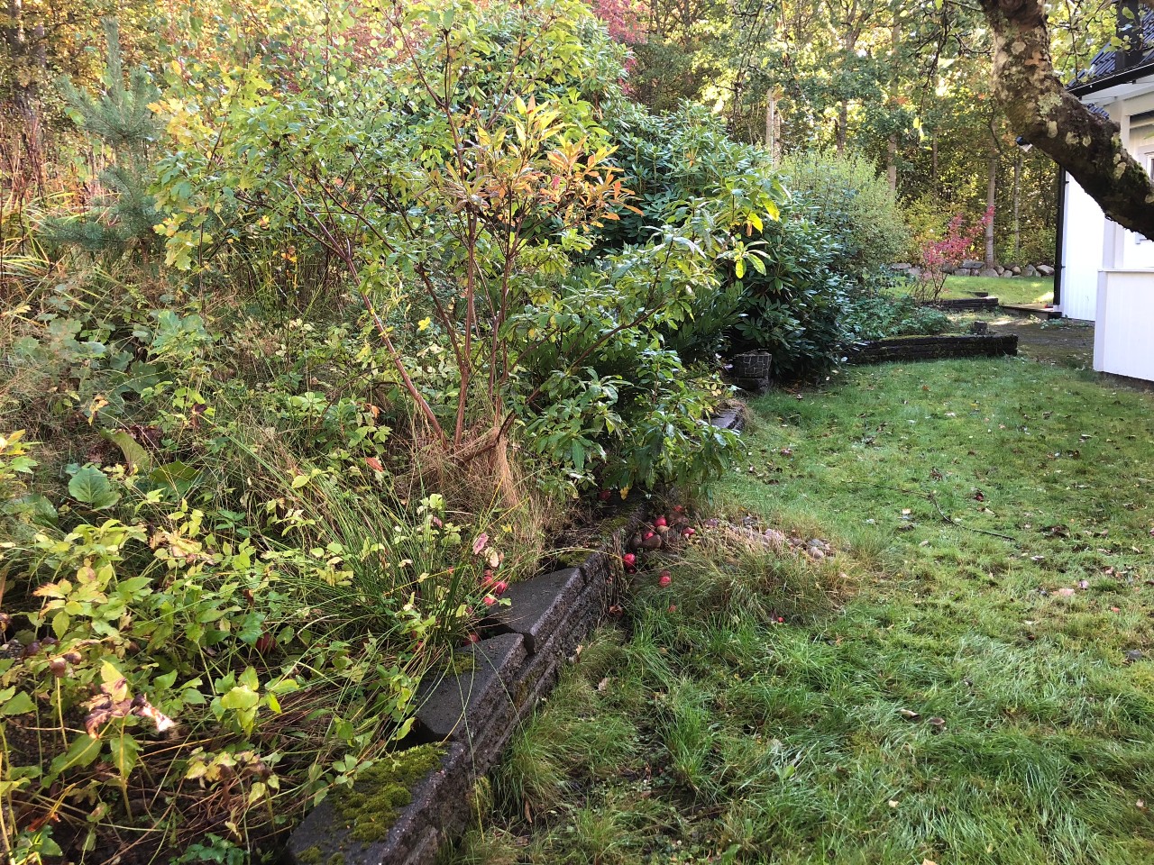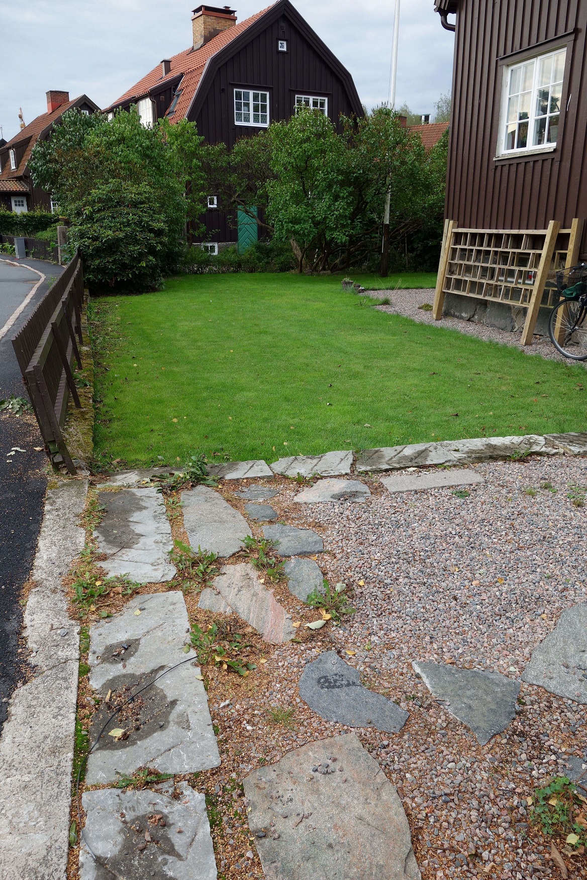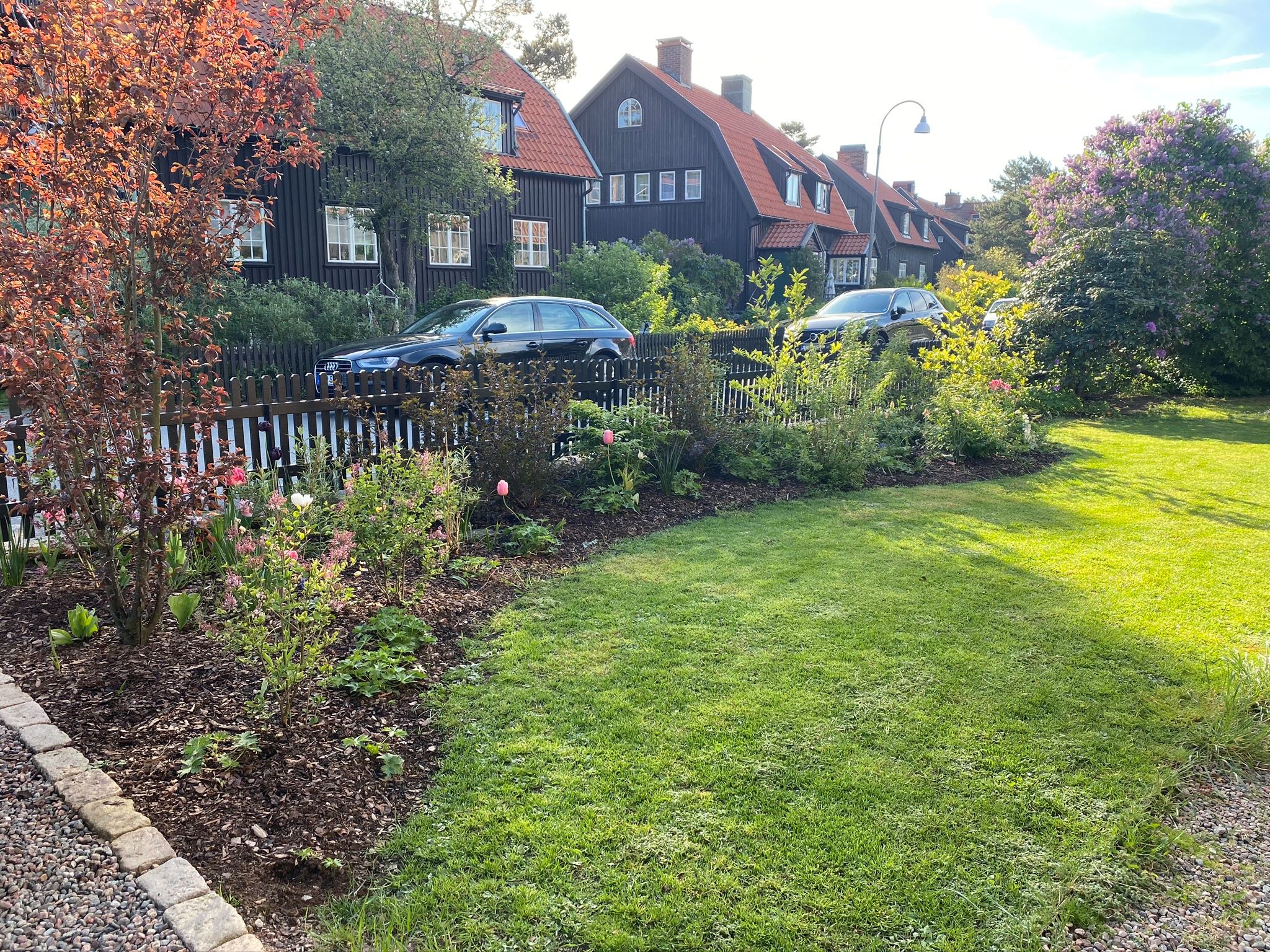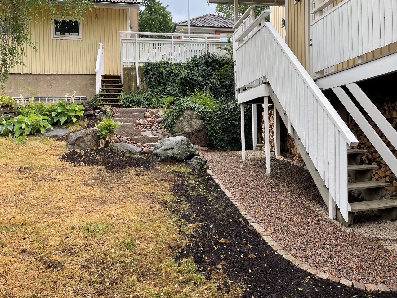 Här har vi gjort om stora delar av trädgården. På framsidan har vi bl.a. bytt trappa, till en i svensk bohusgranit, vi har lagt om Fjäråsgnejsen i två nivåer på framsidan där vi också gjorde rabatter som följde markstensläggningen. Längs gaveln har vi anlagt en rabatt längs staketet för skapa rumslighet och avskildhet i trädgårdens bortre del.