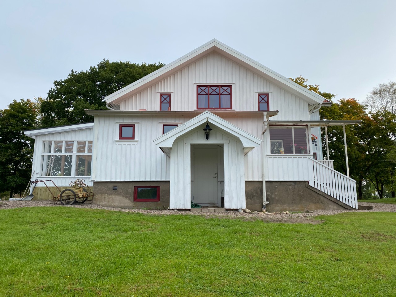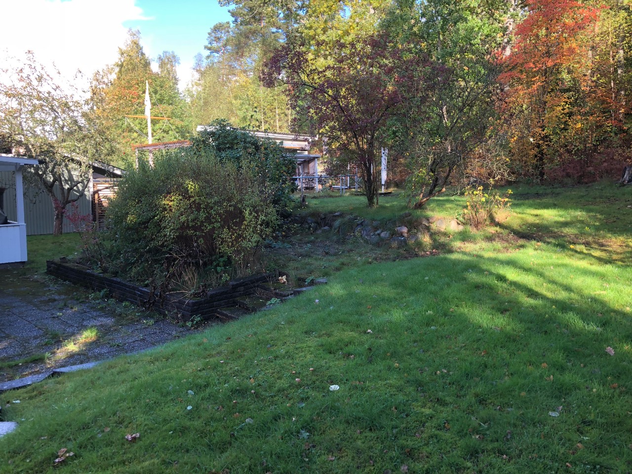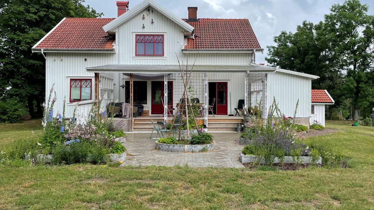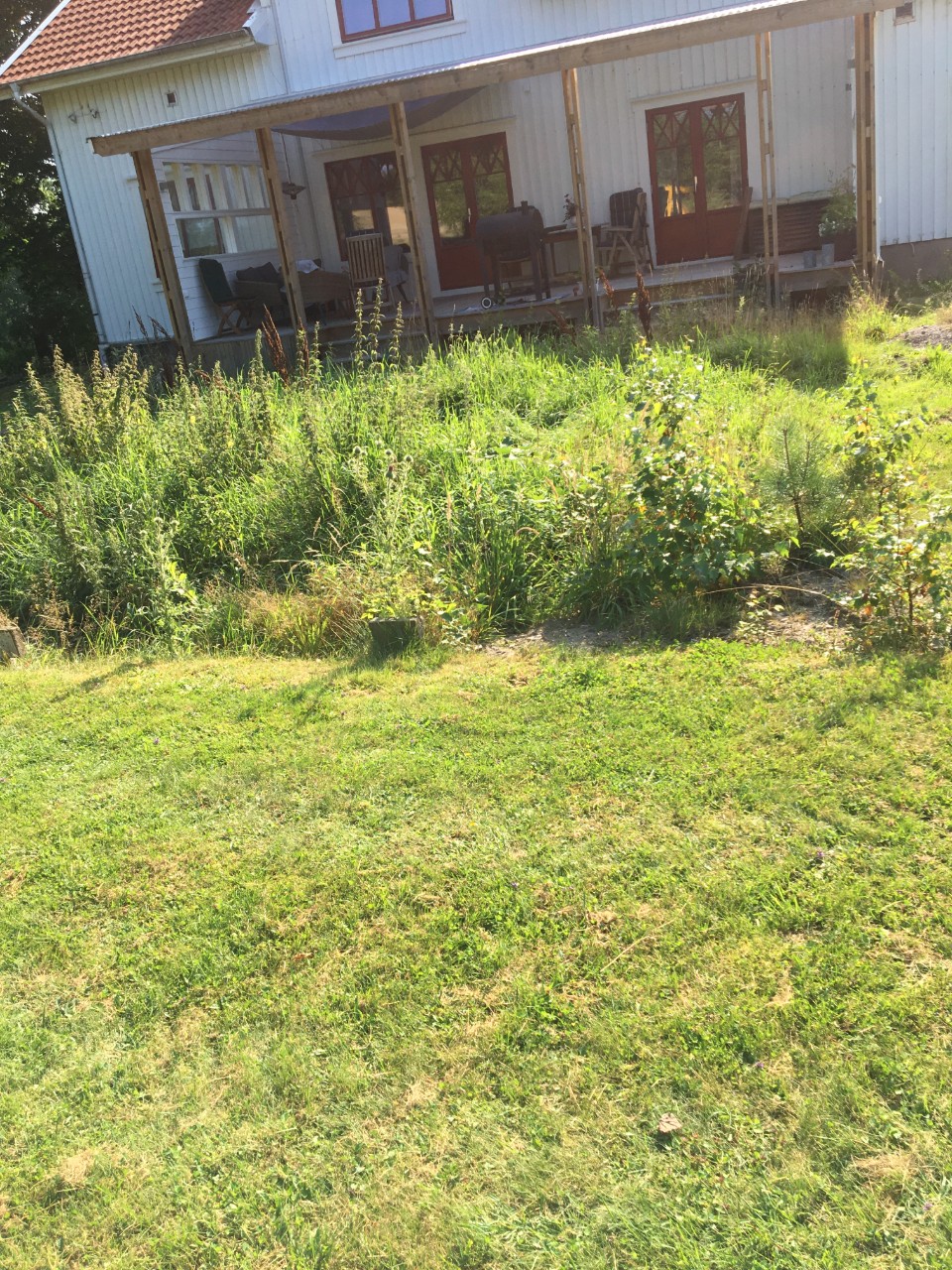 Här har vi gjort om stora delar av trädgården. På framsidan har vi bl.a. bytt trappa, till en i svensk bohusgranit, vi har lagt om Fjäråsgnejsen i två nivåer på framsidan där vi också gjorde rabatter som följde markstensläggningen. Längs gaveln har vi anlagt en rabatt längs staketet för skapa rumslighet och avskildhet i trädgårdens bortre del.