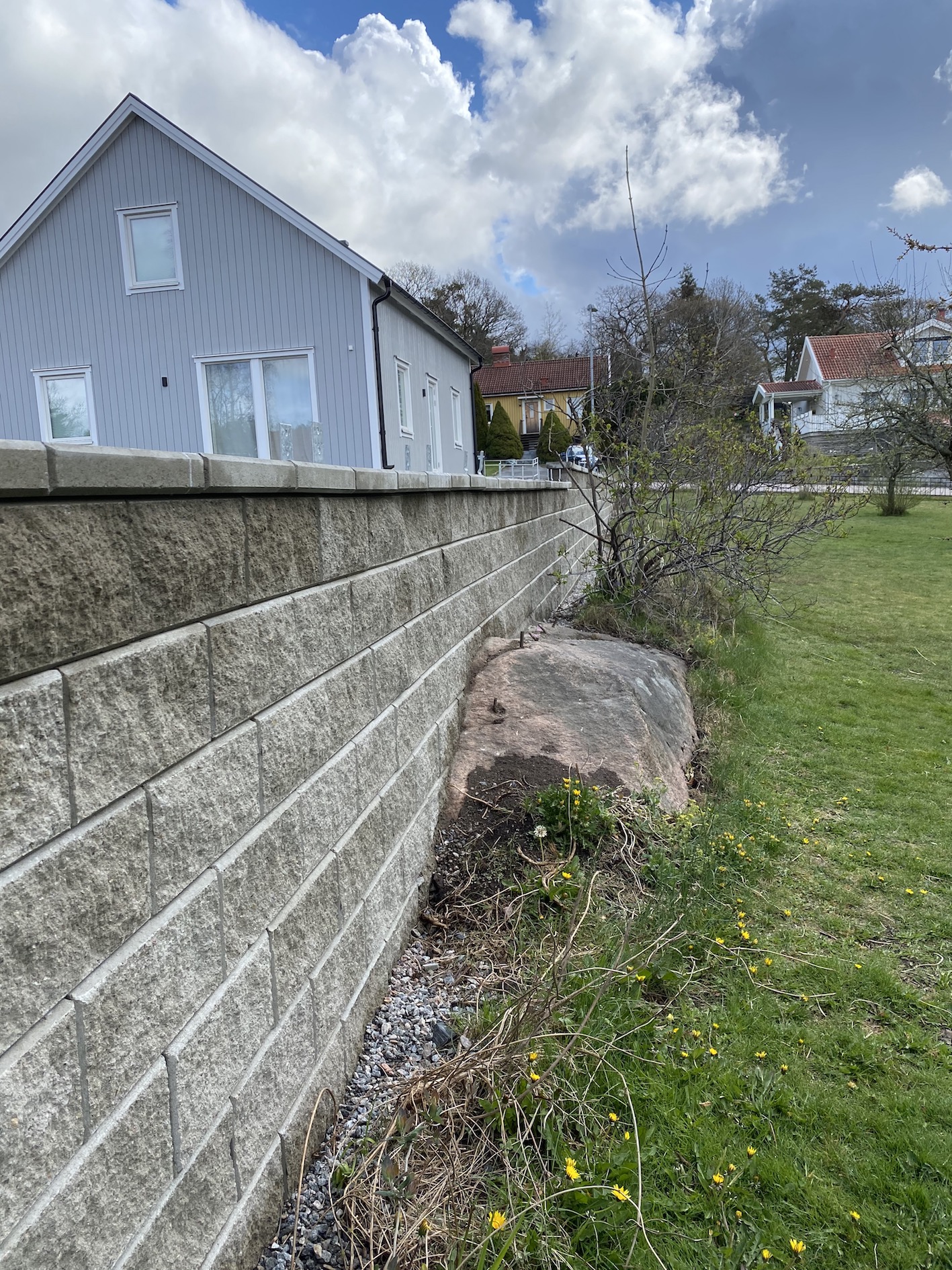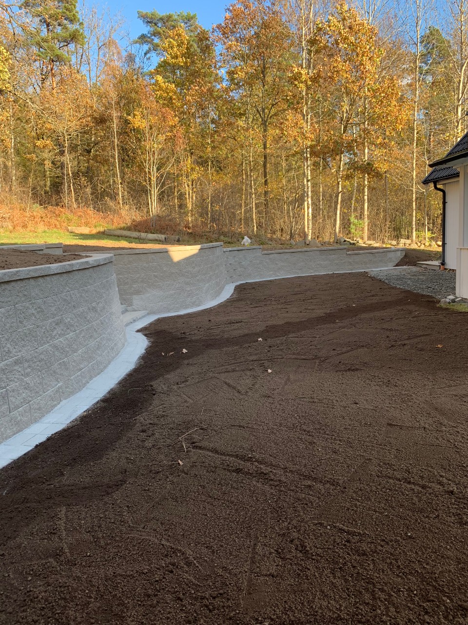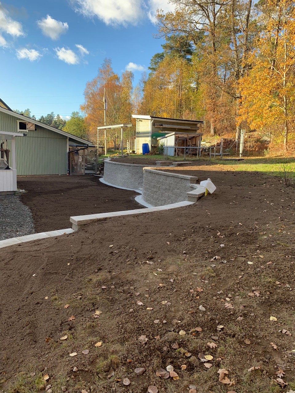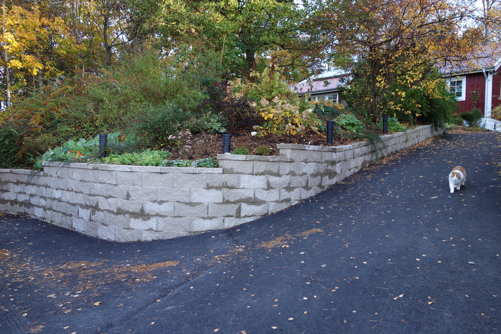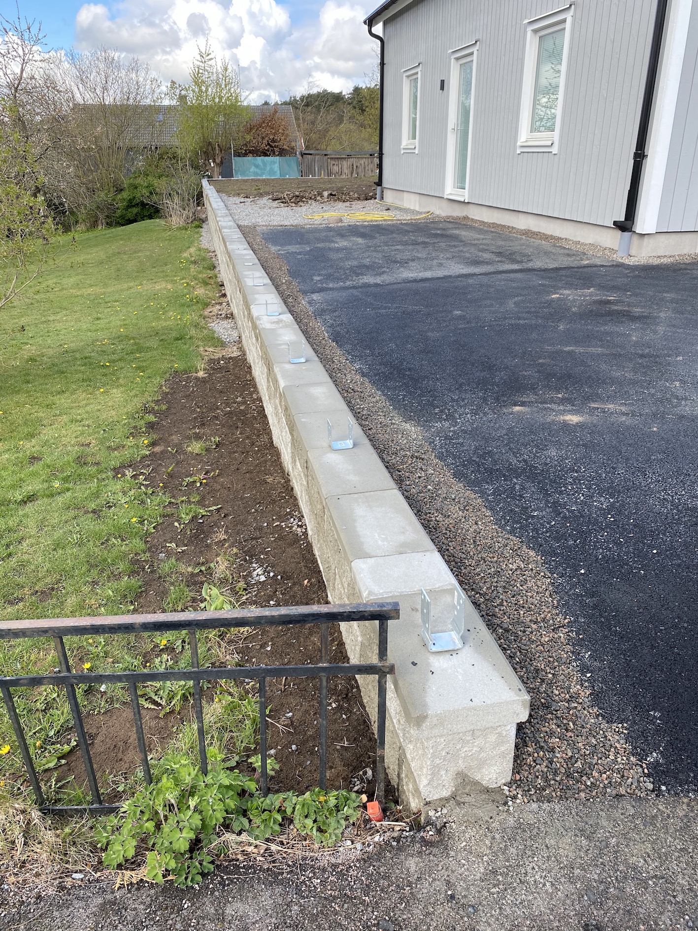 Här har vi ställt en stödmur från Starka, Dolomit heter den. Vi har även förberett för asfaltering och finplanerat baksidan så att kunden kan anlägga gräsmatta. Det ska på ett staket på muren, därav stolpskorna. En bra början på en ny trädgård!