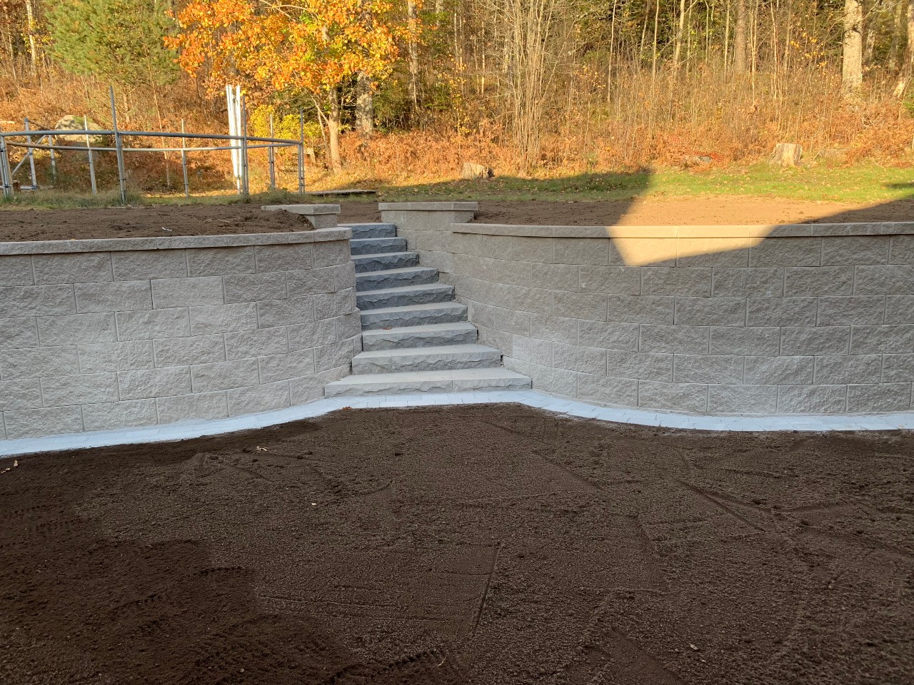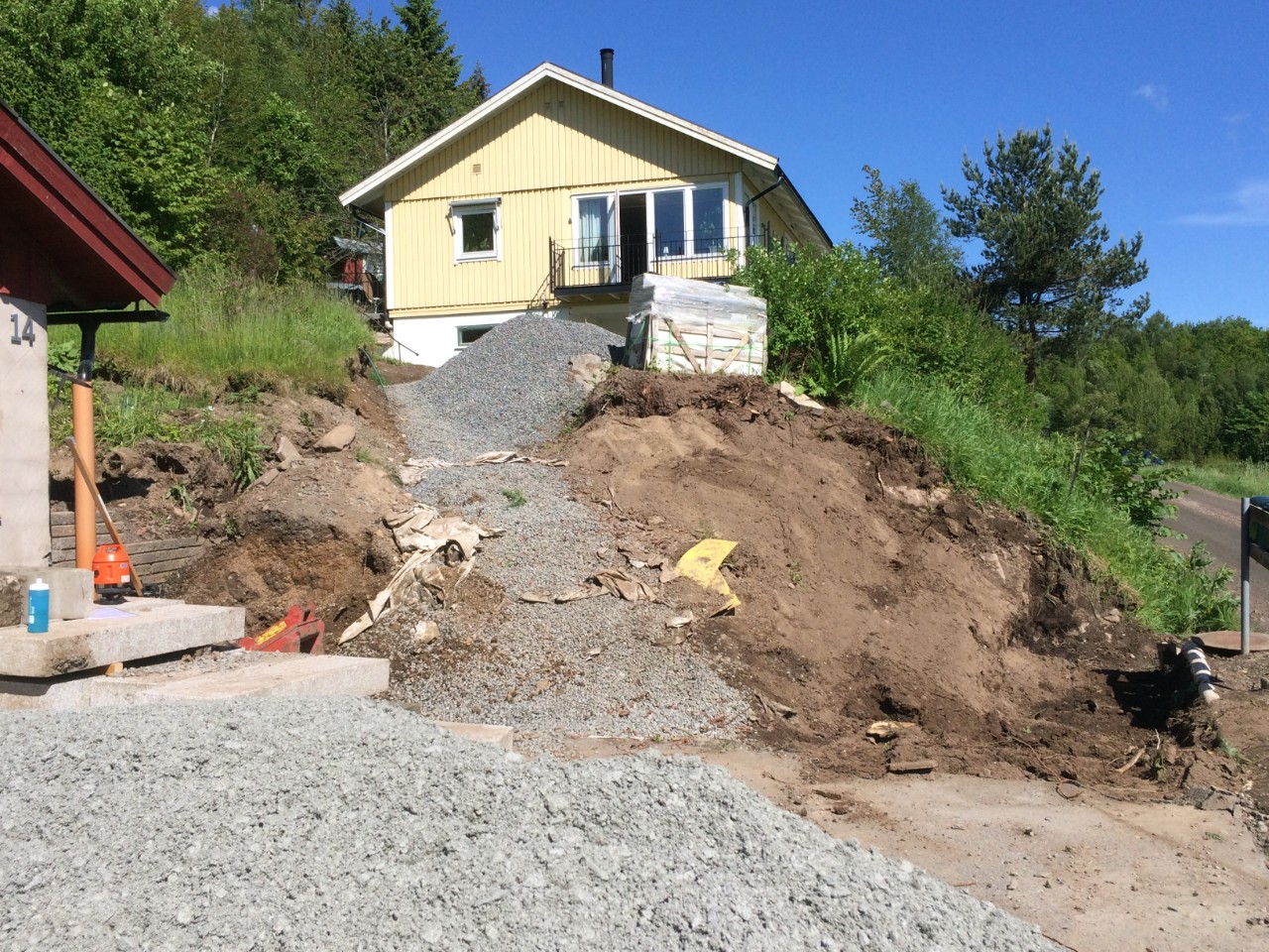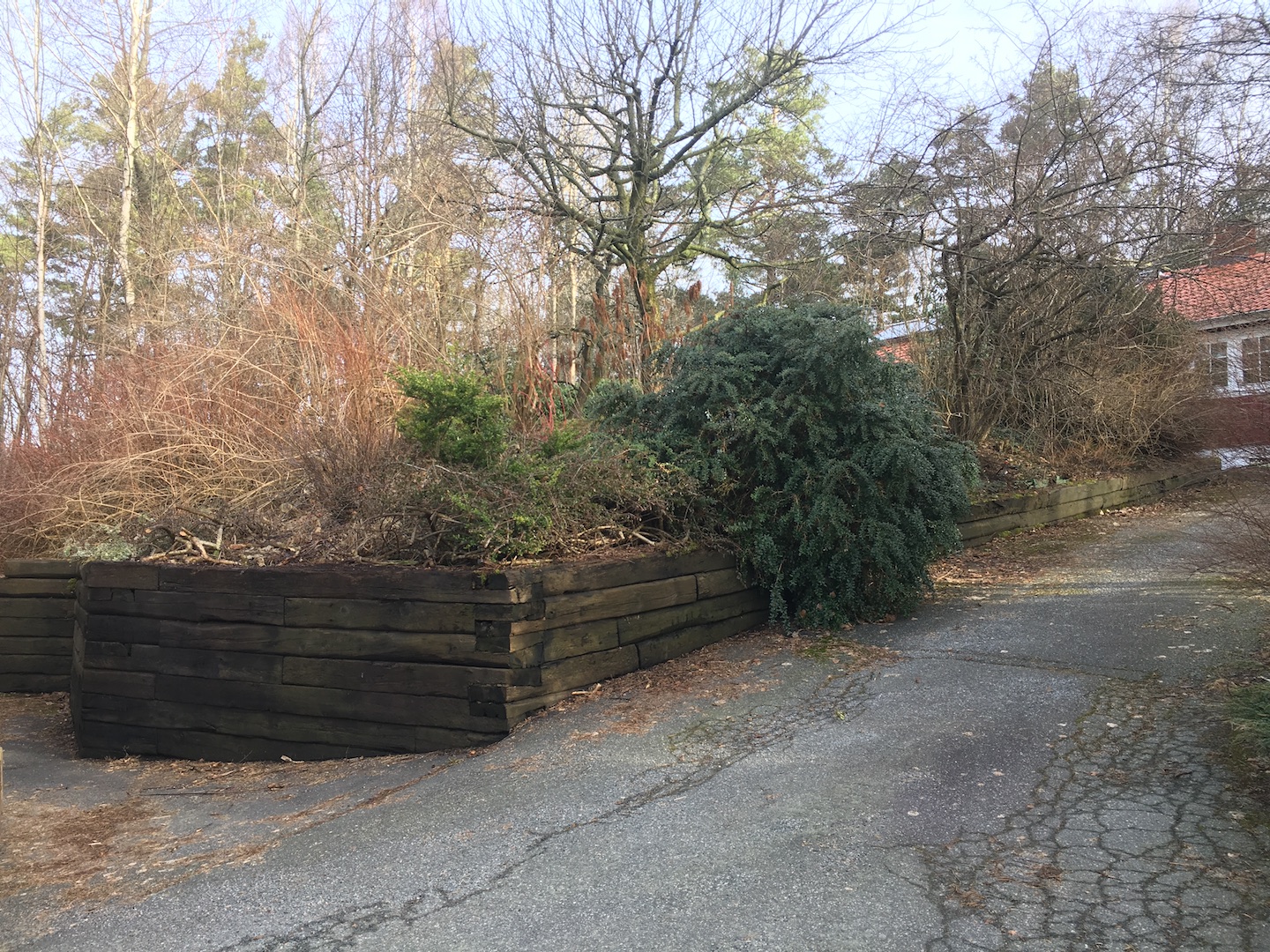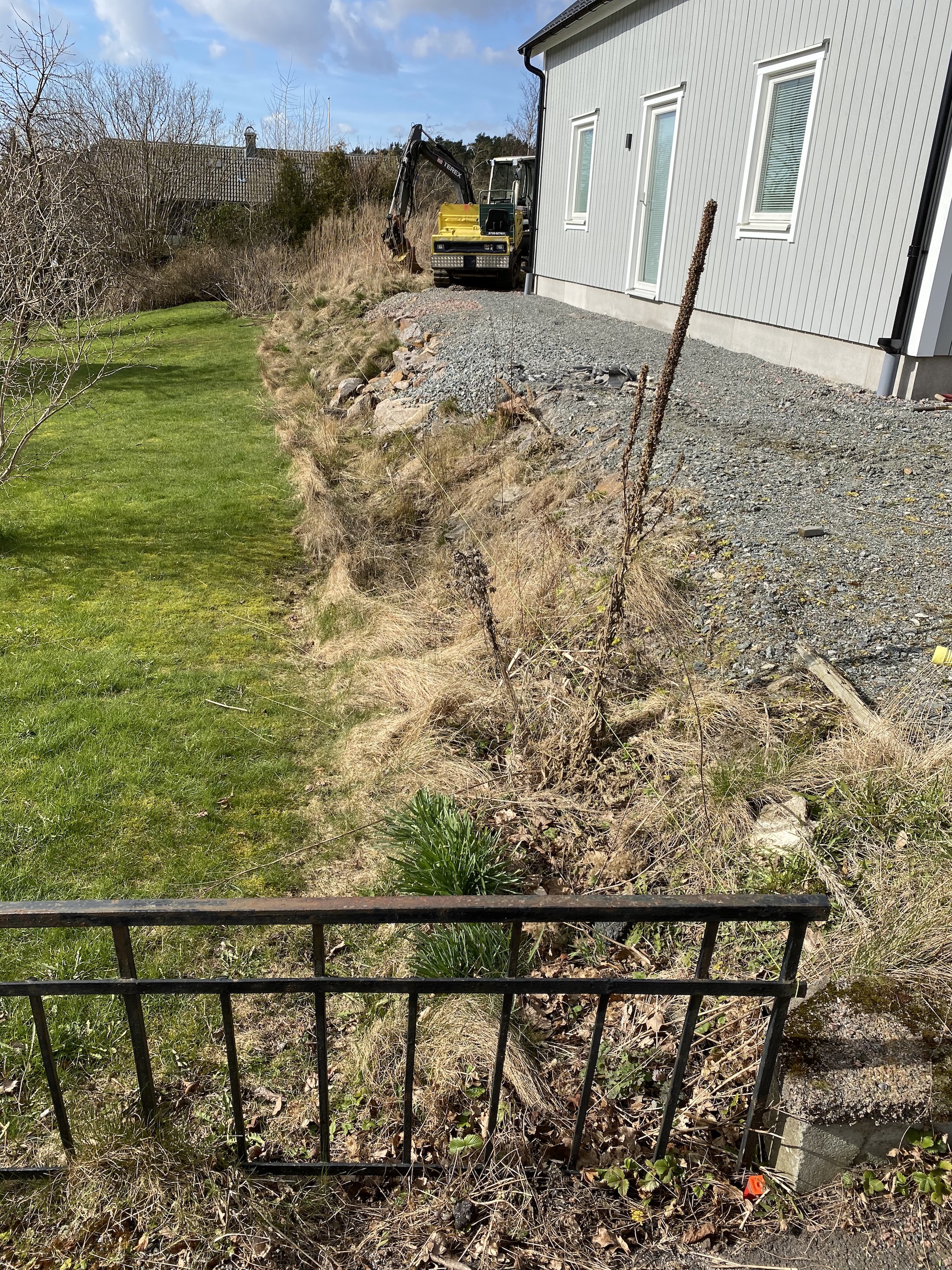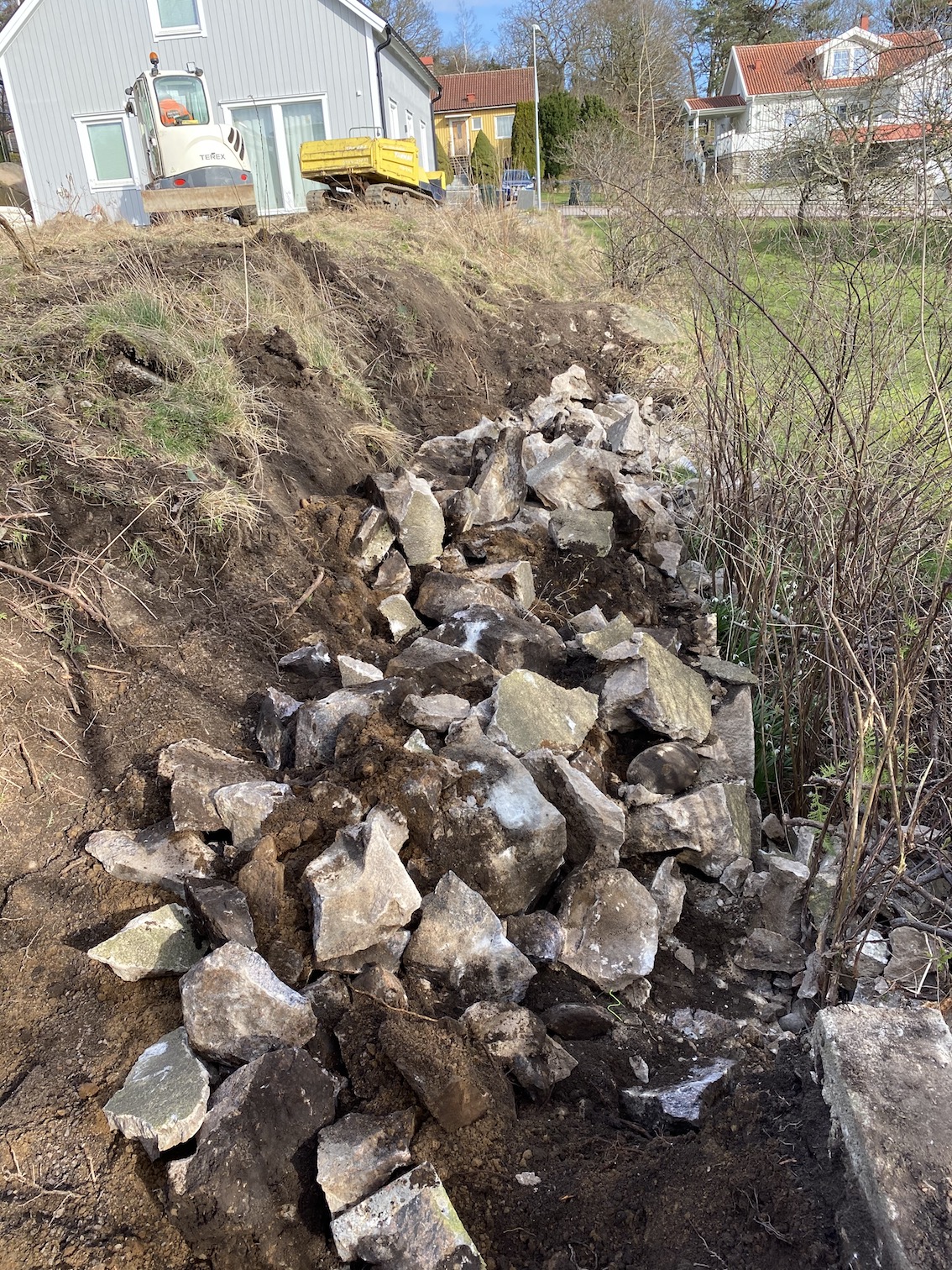 Här har vi ställt en stödmur från Starka, Dolomit heter den. Vi har även förberett för asfaltering och finplanerat baksidan så att kunden kan anlägga gräsmatta. Det ska på ett staket på muren, därav stolpskorna. En bra början på en ny trädgård!