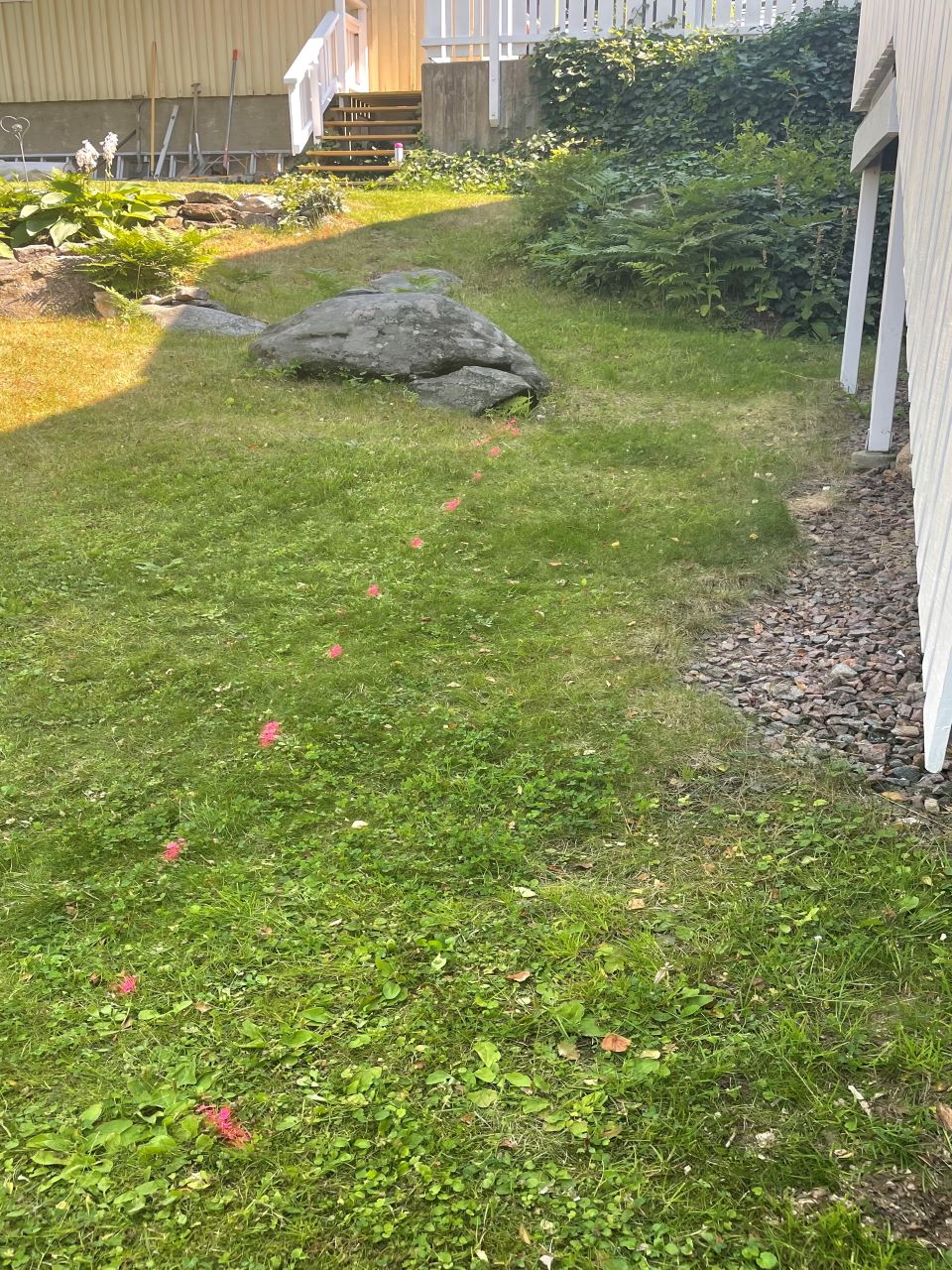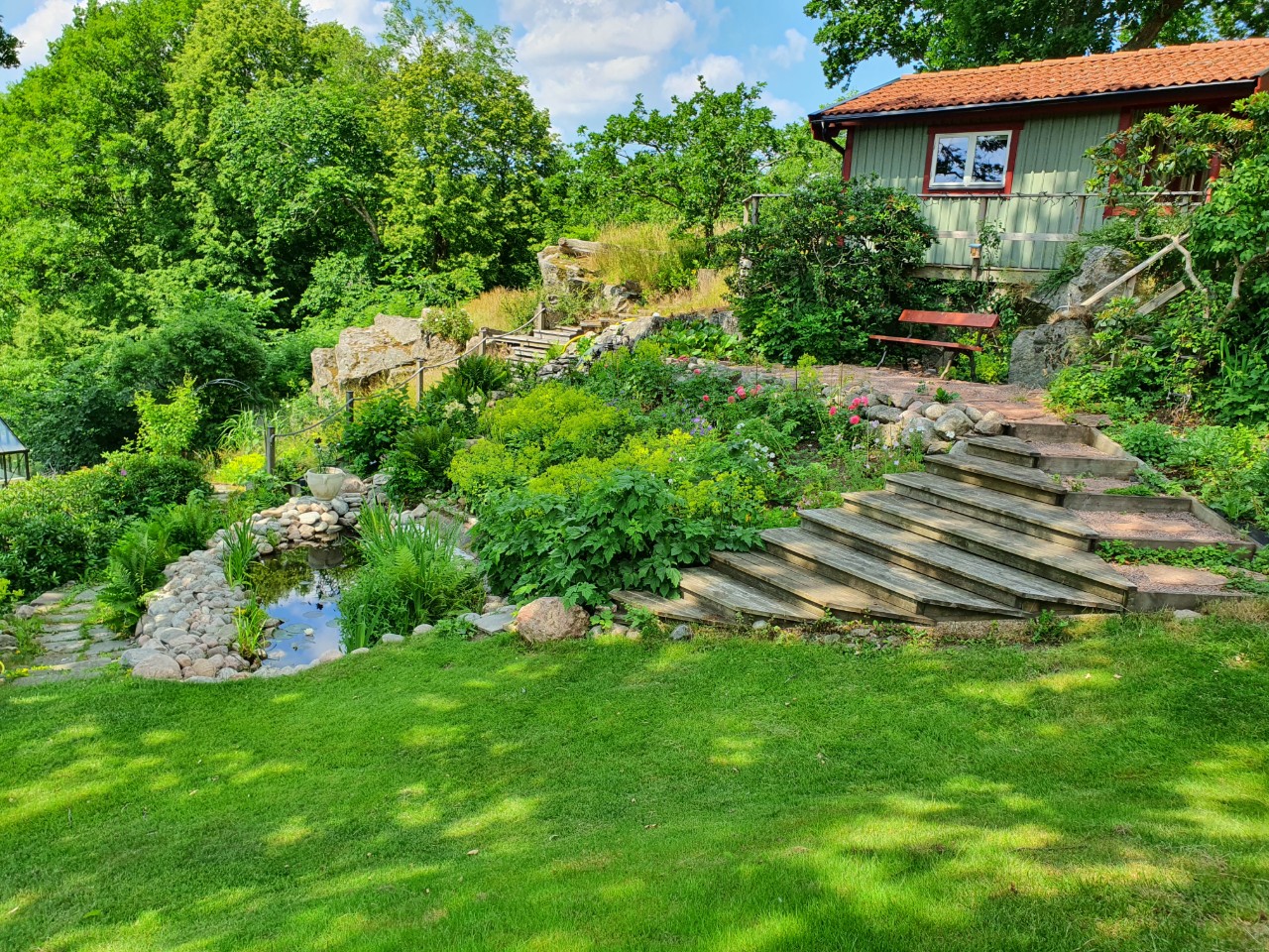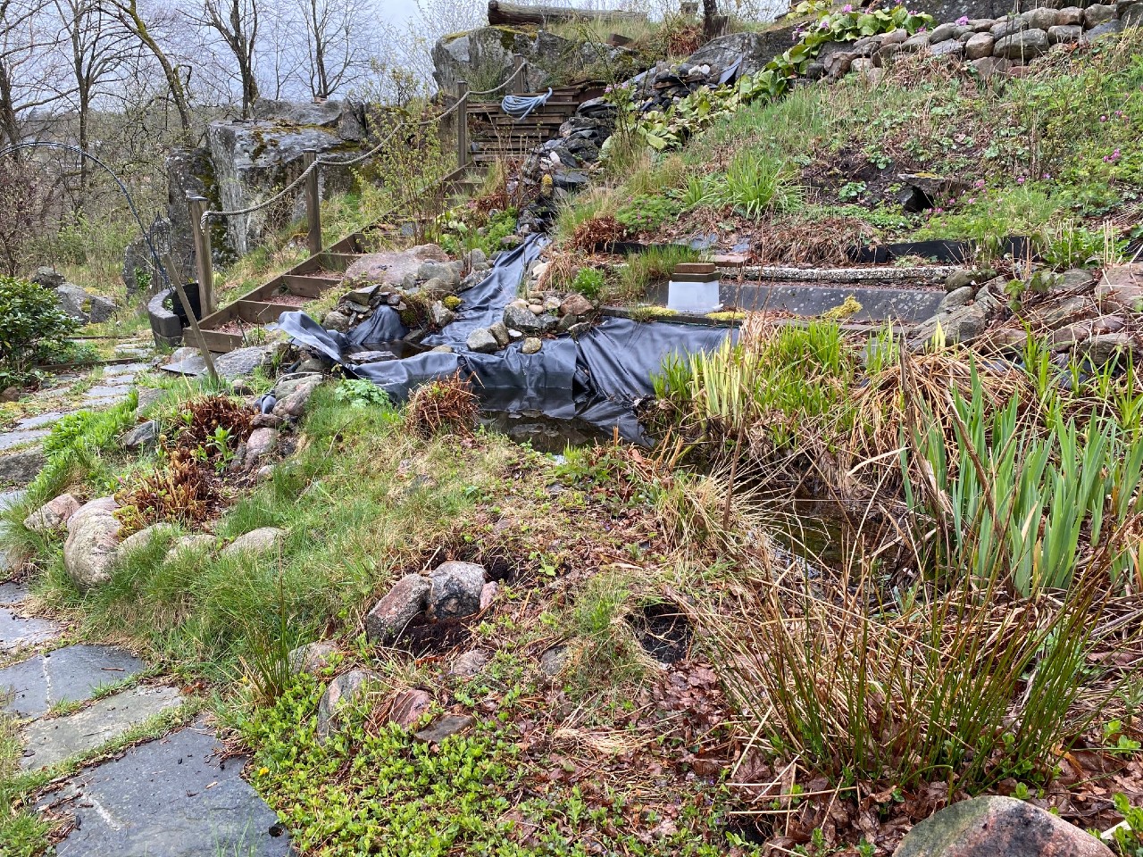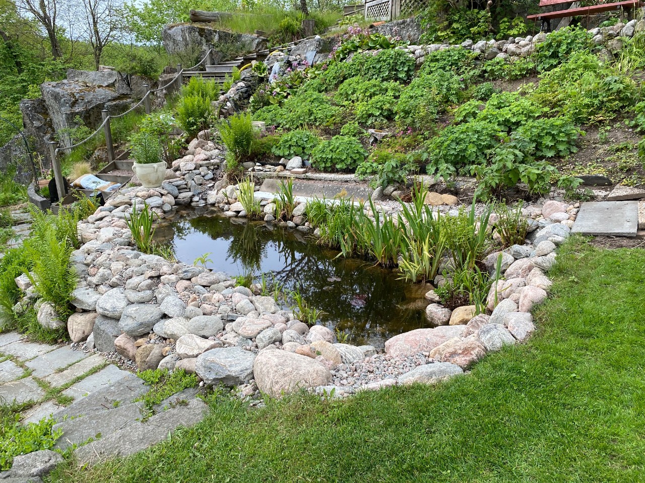 Här har vi restaurerat en gammal damm. Kunden tyckte den var för överväxt och att dammduken snart gjort sitt efter ca 20 år. Vi tog bort all duk, grävde om dammen en del så vi fick trappningar och höjde kanten ut mot gången. Sedan lade vi i ny dammduk och använde kokosnät och natursten för att dölja kanten på duken. Slutligen delade vi lite växter och planterade om i dammen.