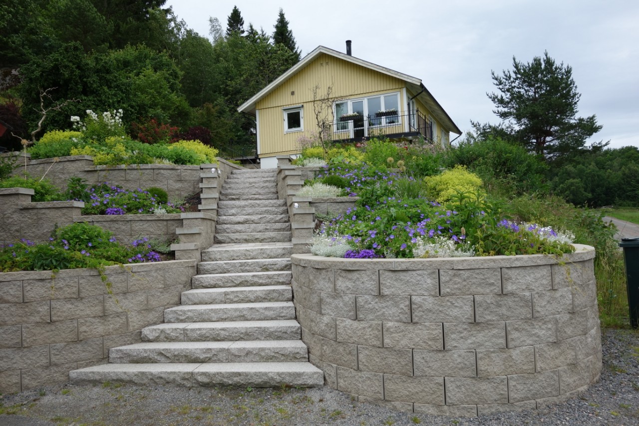 Här byggde vi upp slänten i terasser, satte en trappa i granit med vilplan. Vi planterade också terasserna. Muren är Hedas Keystone, trappan är i granit.