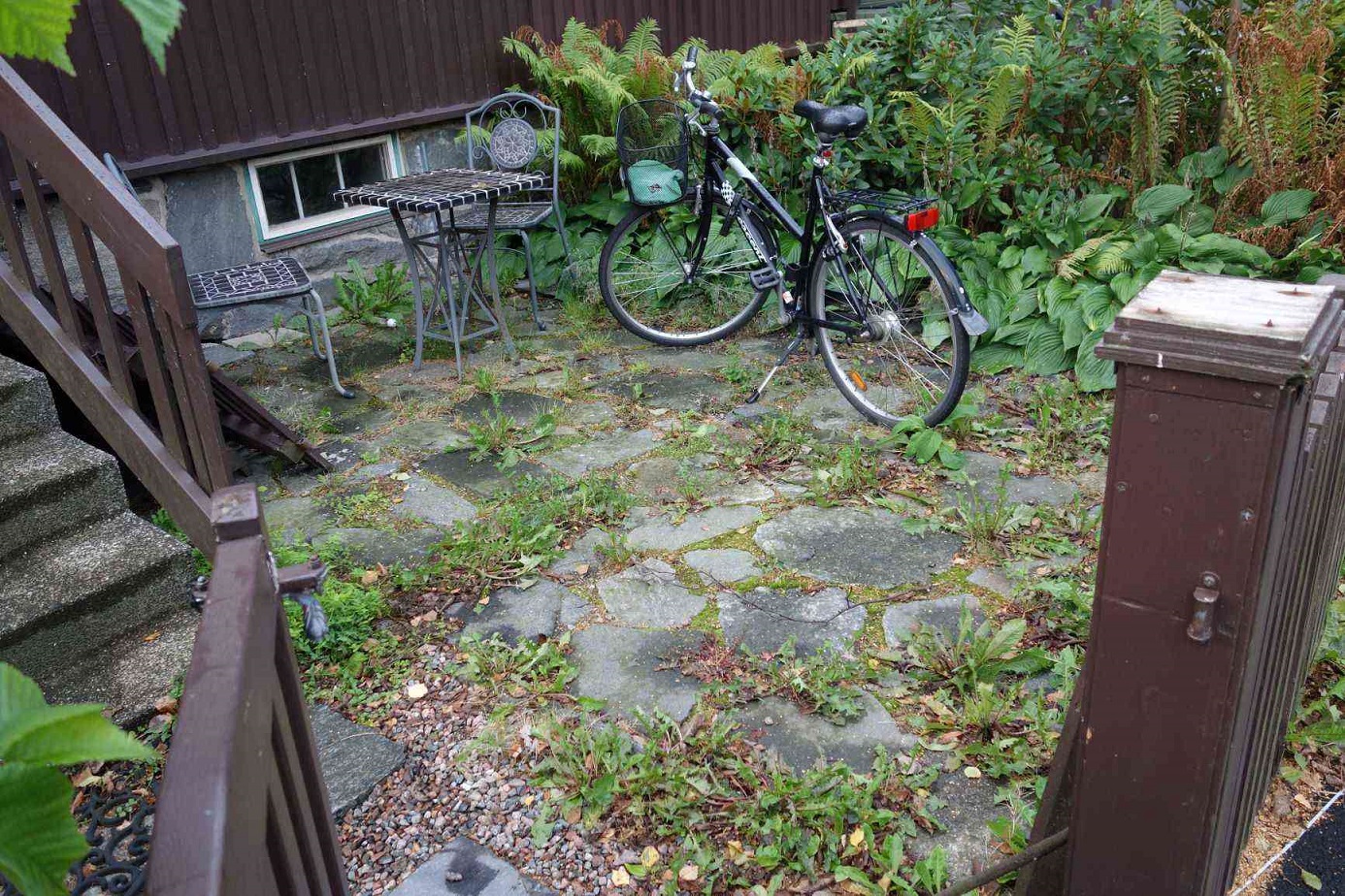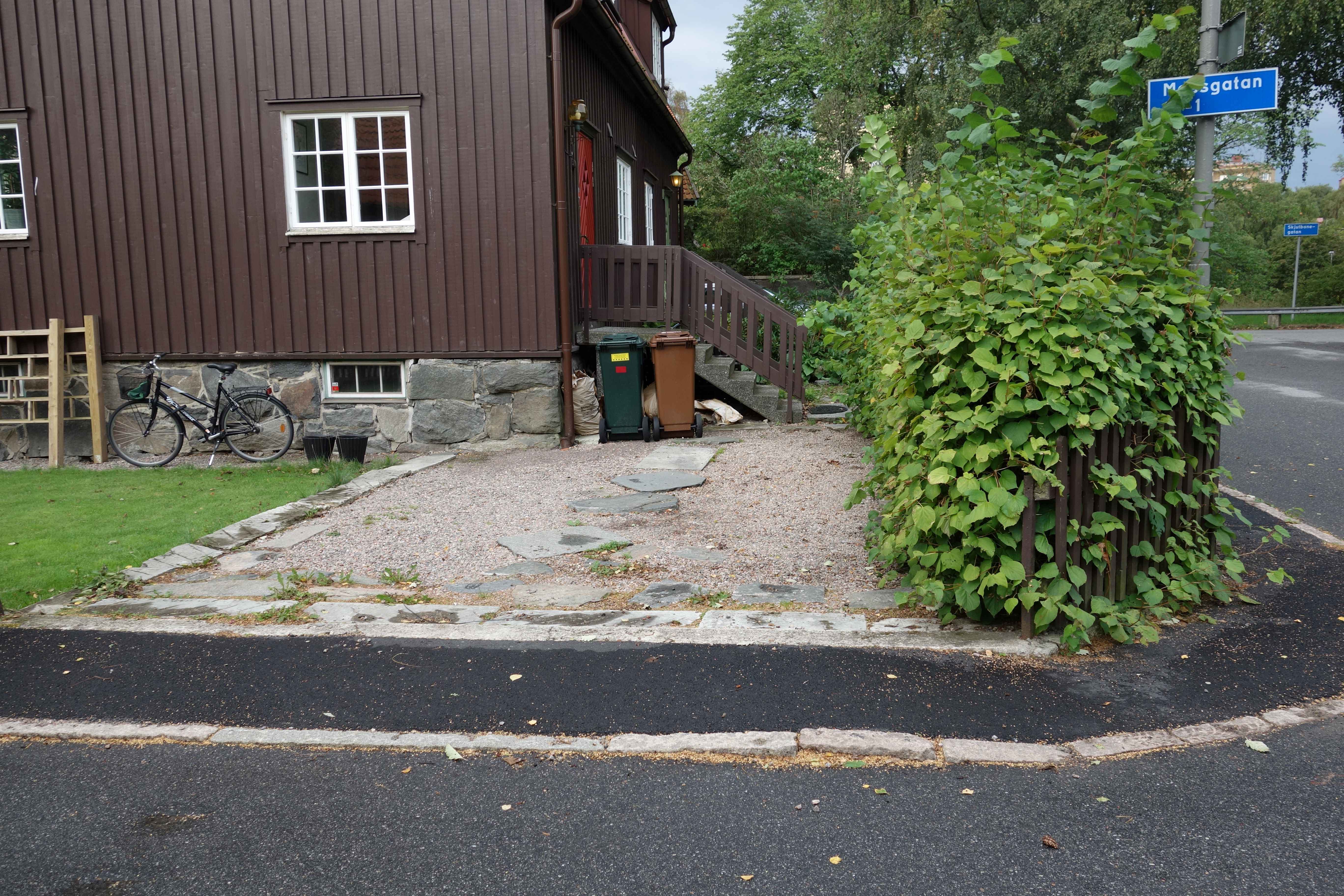 Här har vi bundit ihop de olika trapporna till trädgården och källaringången med trappa och grusgång. Vi har använt kantsten av bohusgranit till trappa, samt kundens egen gatsten som kantsten, gruset är natursingel. Som dekorgrus har vi använt naturrsten i olika storlekar.