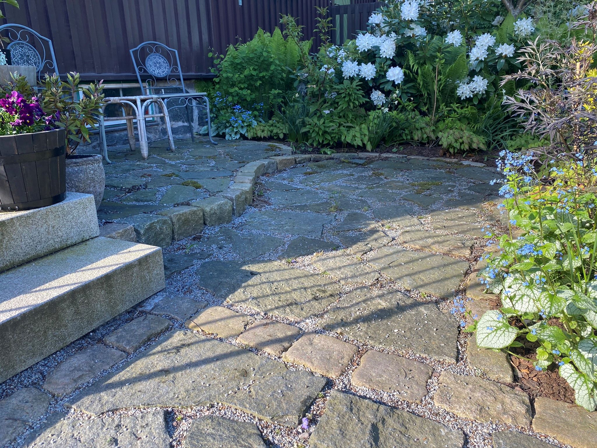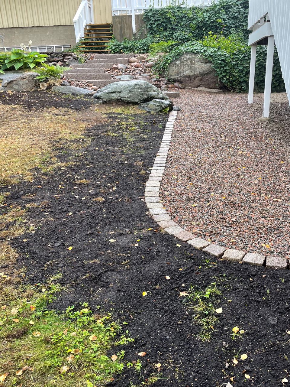 Här har vi anlagt en uteplats med upphöjda rabatter som vi också planterat. Vi har även gjort ordning grusgångarna och anlagt nya rabatter längs husets gavel. Vi har använt oss av granitkantsten, markstenen är Starkas byasten ljusgrå och gruset är natursingel,