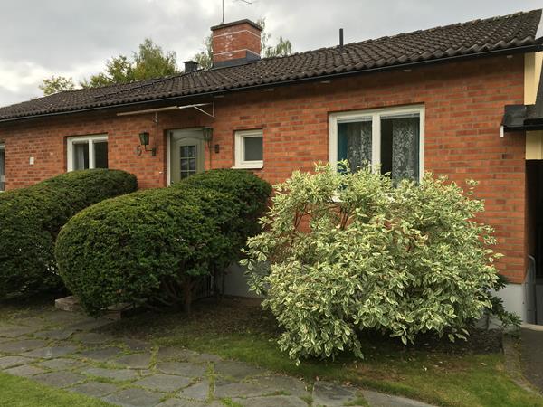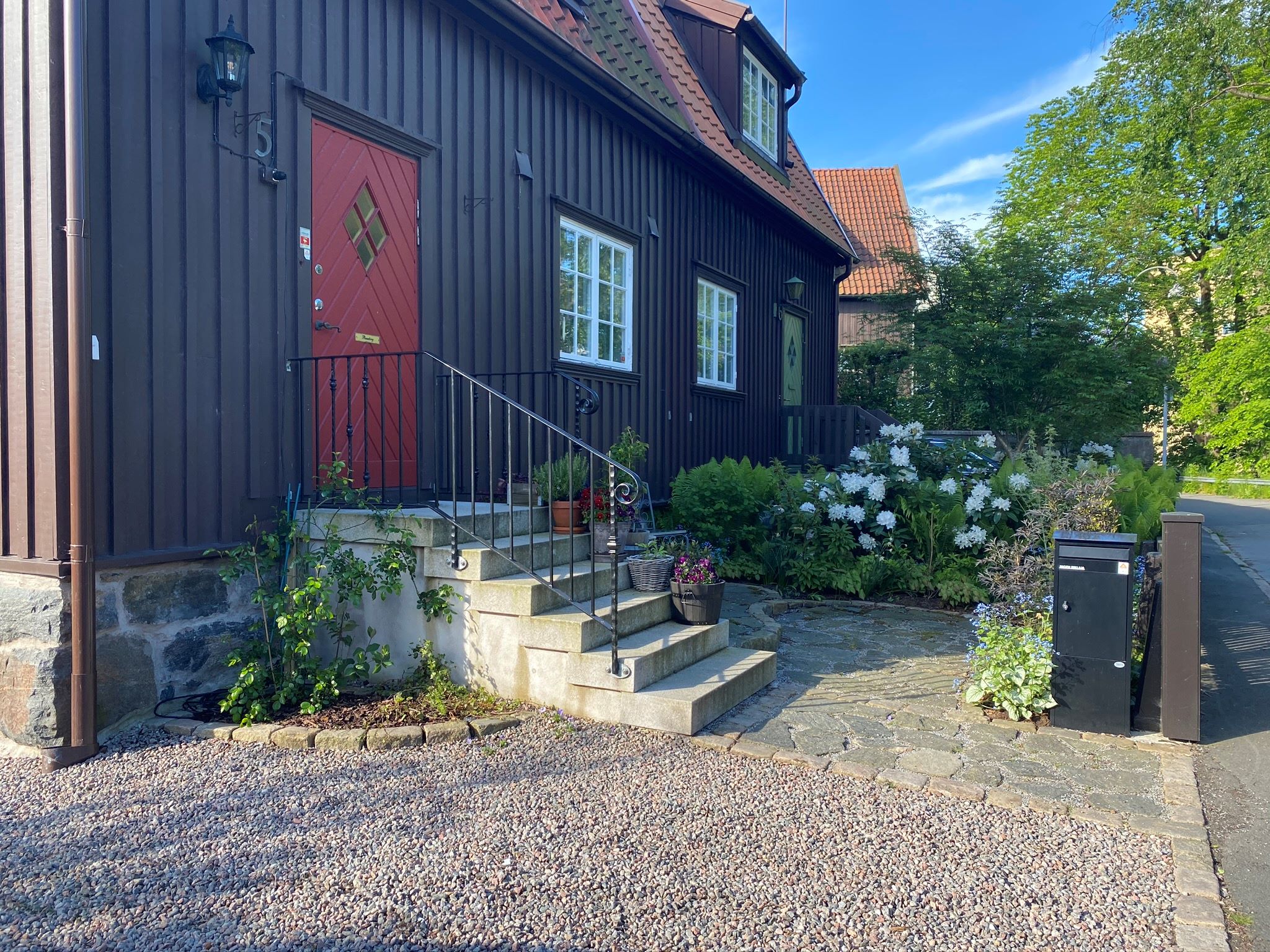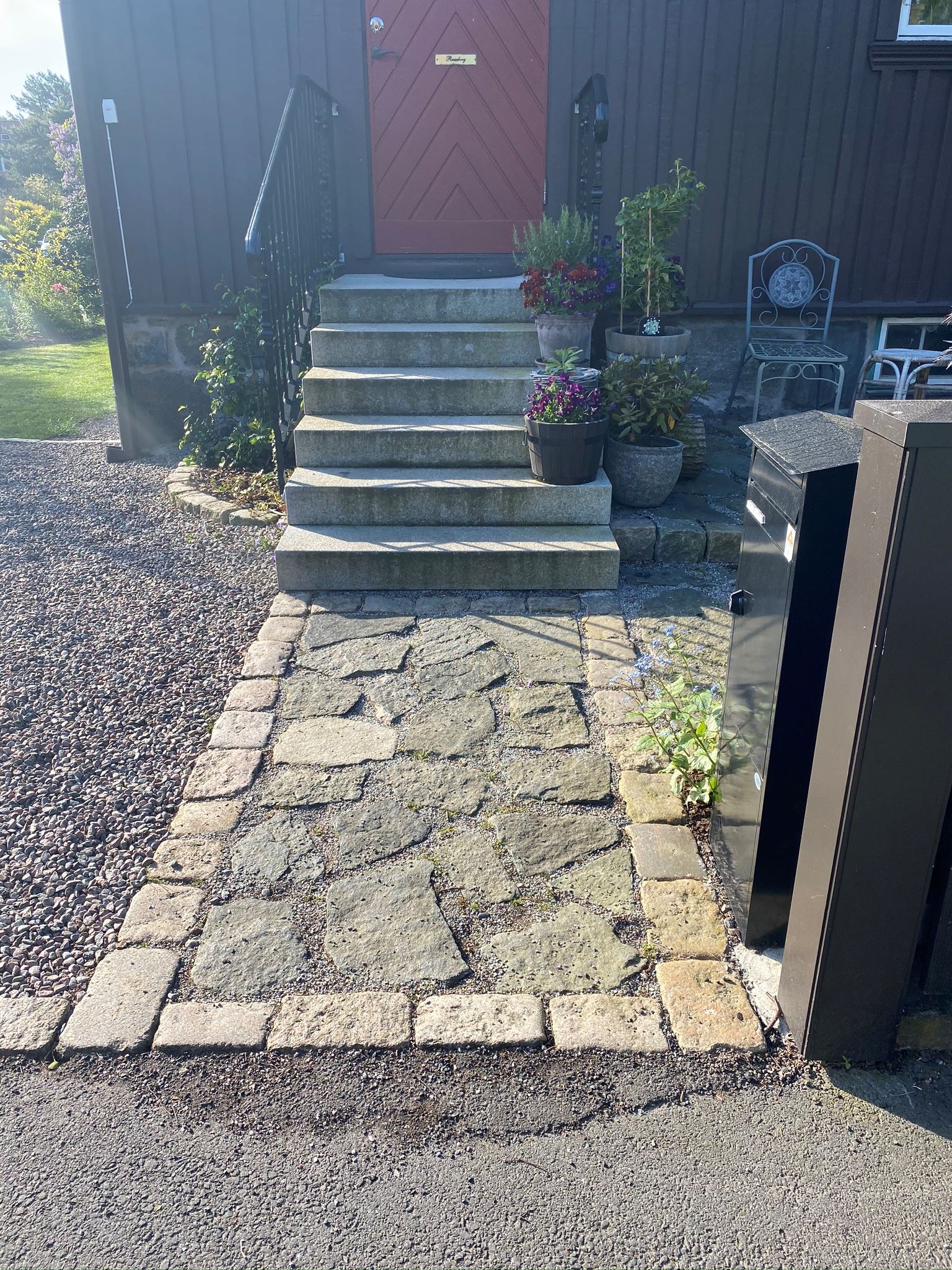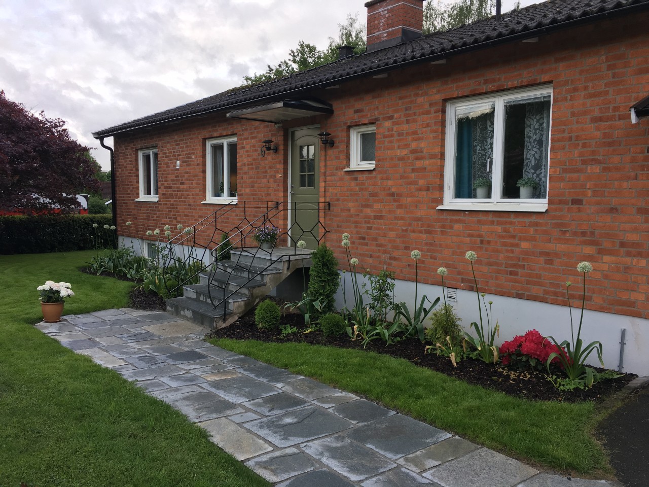 Här uppdaterade vi en framsida med omläggning av marksten, nya rabatter, inklädnad av entrétrappa samt tak ovan ytterdörr.