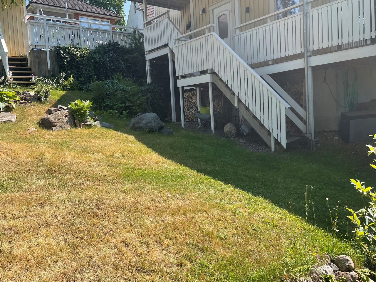 Här hade familjen en slänt som tog upp stor yta från trädgården. Här satte vi istället en stödmur från Heda Keystone Compac samt en trappa i granit för att enkelt nå övre plan. Vi lade även marksten närmaste muren för att underlätta gräsklippningen framöver.